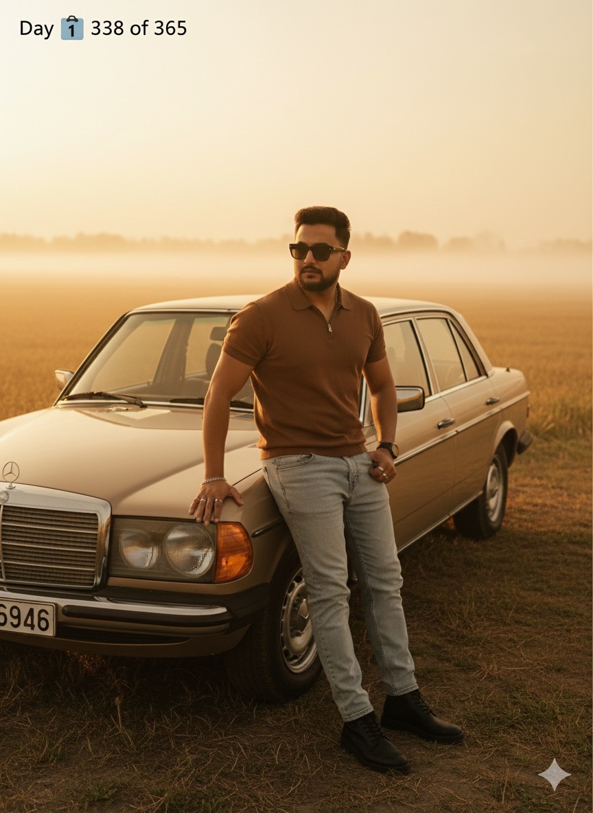 “Full-body portrait of a young man face clearly visible to viewers, exact same as uploaded image with short hair leaning on the hood of a vintage beige Mercedes (left front visible), one hand resting on the car, other on his hip; he wears a brown short-sleeve zip polo, light grey jeans, black boots and a wristwatch — standing in a misty golden field with low fog, cinematic warm tones, centered composition, high-resolution, subtle film grain;