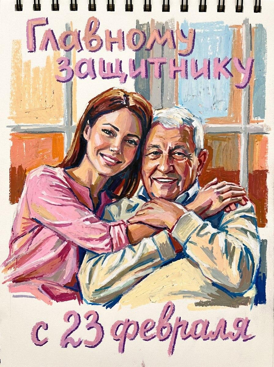 Сделай открытку из этого фото. Сохрани черты лица и позу. Открытка должна быть посвящена 23 февраля с текстом [Главному защитнику] и [с 23 февраля]. Открытка сделана в стиле: А bold editorial fashion illustration rendered in thick oil pastel or wax crayon, with chunky, textured strokes on visible sketchbook paper. It should feel chic and modern, focusing on outfit and pose through expressive color blocks rather than outlines or realism.формат 3:4